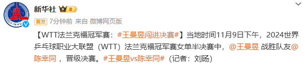 据新华社微博消息,当地时间11月9日下午,2024世界乒乓球职业大联盟(WTT)法兰克福冠军赛女单半决赛中,王曼昱战胜队友陈幸同,晋级决赛。
