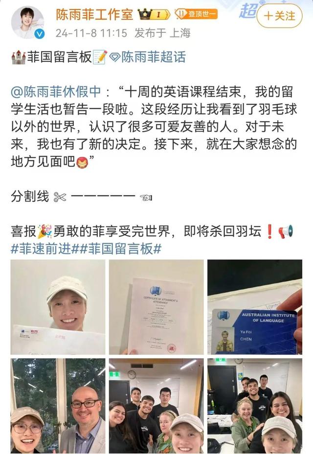 在总结中,陈雨菲表示自己对于未来已经有了新的决定,“十周的英语课程结束,我的留学生活也暂告一段啦。这段经历让我看到了羽毛球以外的世界,认识了很多可爱友善的人。对于未来,我也有了新的决定。接下来,就在大家想念的地方见面吧。”
