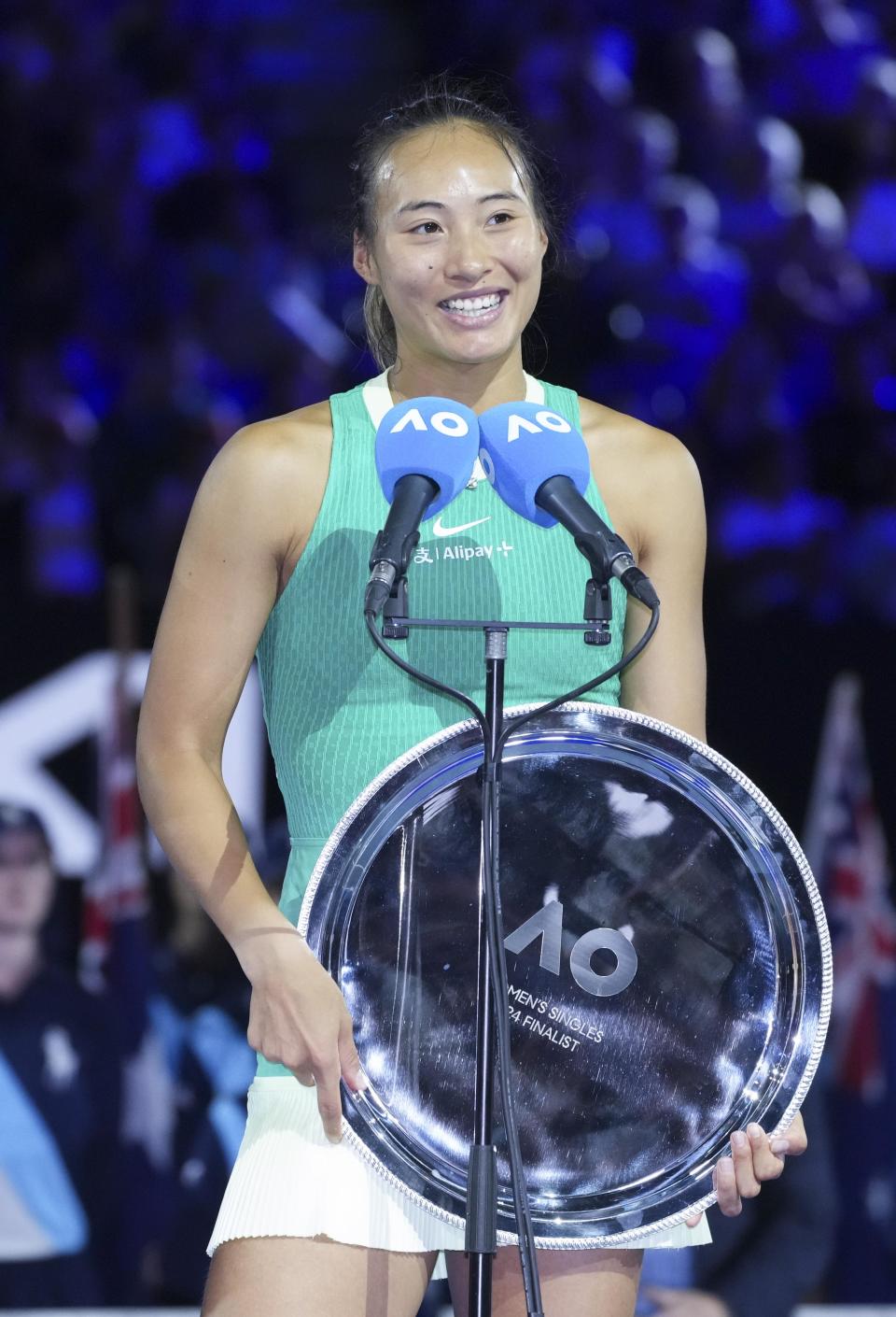1月27日,郑钦文在澳网女单颁奖仪式上发言。新华社记者 王申 摄