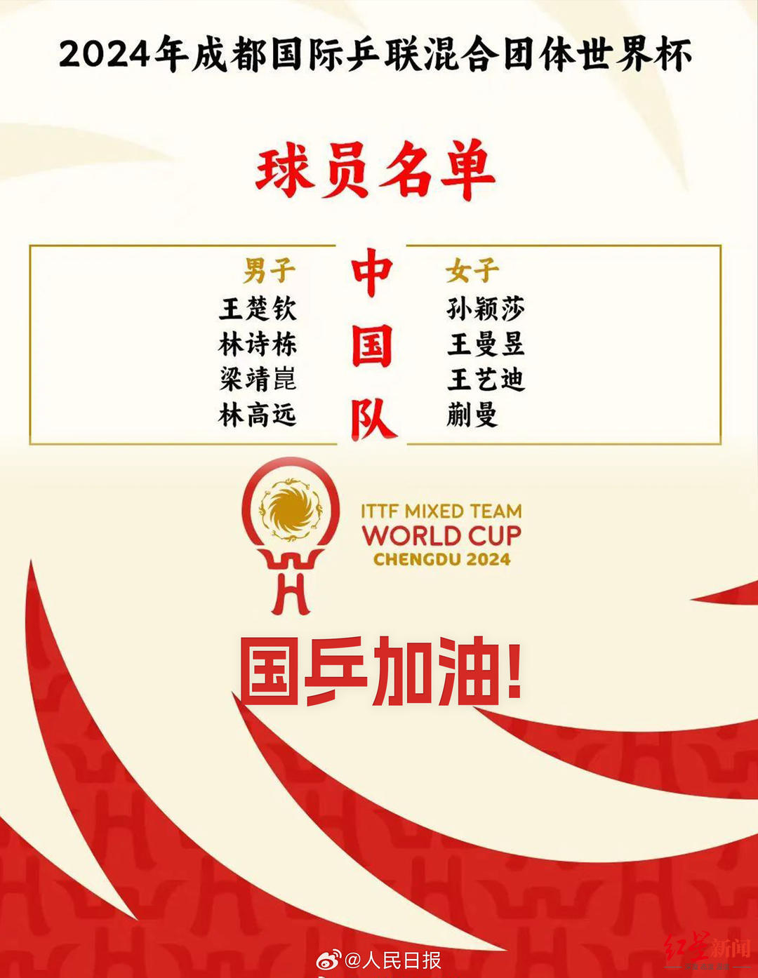 2024年成都国际乒联混合团体世界杯(简称成都混合团体世界杯)将于12月1日至8日在四川省体育馆举行。国际乒联于今日正式公布参赛球员名单,中国队参赛阵容为:男选手王楚钦、林诗栋、梁靖崑、林高远,女选手孙颖莎、王曼昱、王艺迪、蒯曼。樊振东、马龙和陈梦没有参加。去年首届混合团体世界杯决赛,中国队8-1击败韩国队,顺利夺冠。