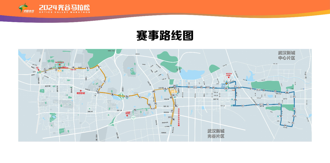 赛道整体沿用去年“一城两廊三区万企”的经典赛道,赛道起点设在华中科技大学,健康跑终点设在光谷国际网球中心,半程终点是超级“绿丝带”光谷生态大走廊,马拉松项目的终点设在武汉未来科技城“马蹄莲”。为进一步优化跑友赛道体验,2024光谷马拉松对后半程线路进行了优化,全马35-41公里段赛道调整为高新二路和光谷八路,冲刺阶段赛道坡度更加平缓。