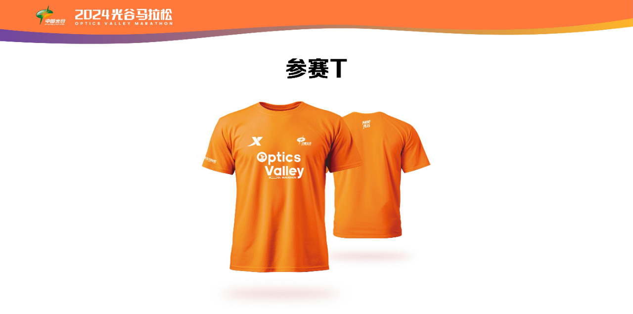比赛参赛服采用活力橙设计,灵感源自光谷独特的创新文化,正面印有马蹄莲和光谷马拉松英文“OpticsValleyMarathon”,象征着光谷的活力与国际化。背面印有本届光谷马拉松主题“奔跑吧,光谷”。整体设计删繁就简,着重展现中国光谷攀“高”向“新”迈向世界光谷的蓬勃活力,激励每位参赛者在光马赛道上追逐梦想。