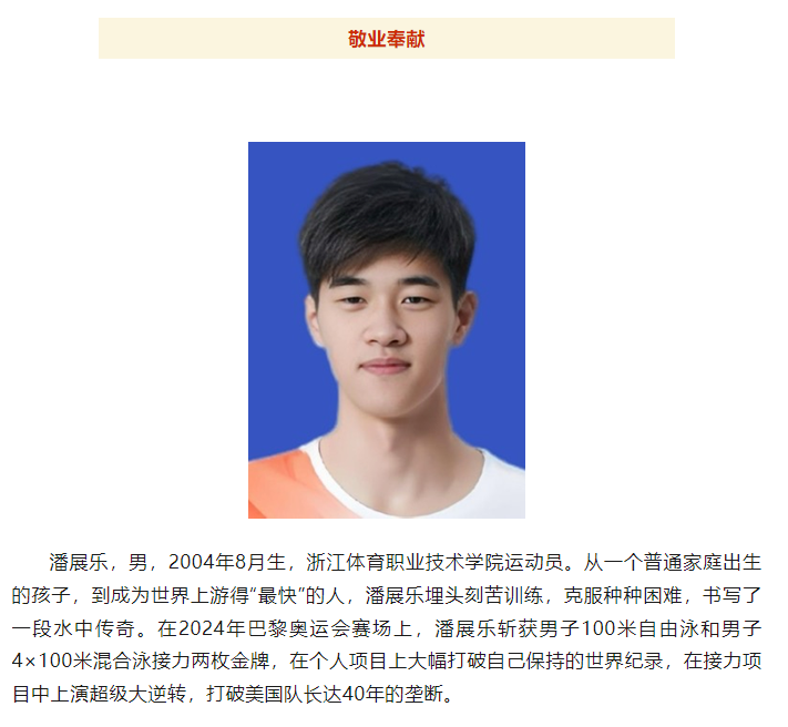 潘展乐,男,2004年8月生,浙江体育职业技术学院运动员。从一个普通家庭出生的孩子,到成为世界上游得“最快”的人,潘展乐埋头刻苦训练,克服种种困难,书写了一段水中传奇。在2024年巴黎奥运会赛场上,潘展乐斩获男子100米自由泳和男子4×100米混合泳接力两枚金牌,在个人项目上大幅打破自己保持的世界纪录,在接力项目中上演超级大逆转,打破美国队长达40年的垄断。