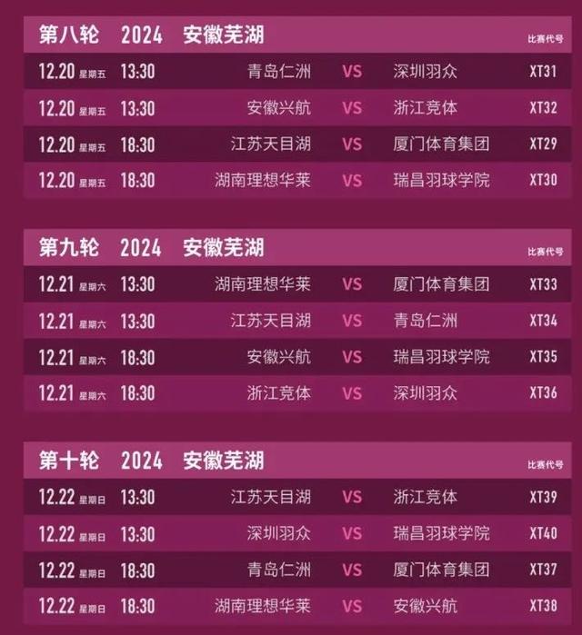 其中,12月20日至22日,第二循环第8轮至第10轮的比赛将在安徽芜湖航空新城运动中心举行。按照赛程,常规赛每一个比赛日分两个时间段进行比赛,第一时间段是13点30分,第二时间段是18点30分。