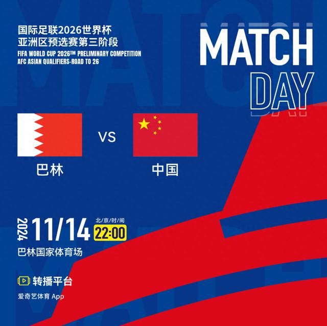 北京时间11月14日22时,2026年美加墨世界杯亚洲区预选赛18强赛第五轮比赛,中国国家男子足球队将在客场对阵巴林队。