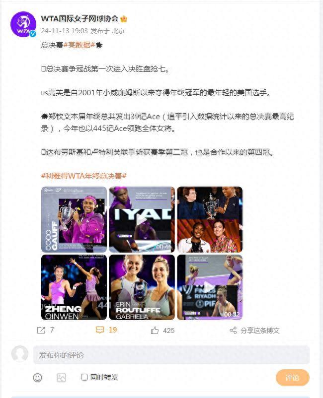 WTA国际女子网球协会官方微博11月13日晚发布的数据显示,2024年,中国“金花”郑钦文以445记ACE领跑全体女将,其中,2024年WTA年终总决赛5场比赛共轰出39记ACE球,追平了引入数据统计以来的总决赛最高纪录。