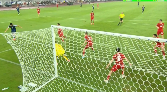 第35分钟,町田浩树左路传中,守田英正脚后跟一磕,镰田大地领球过掉防守球员后横传门前,小川航基上前想要推射造成对方球员胡伯纳乌龙。日本队1:0领先。仅仅5分钟后,日本队又是突然提速,三笘薰左路外脚背横传,南野拓实跟上左脚低射,皮球击中立柱内侧弹入球网,2:0。