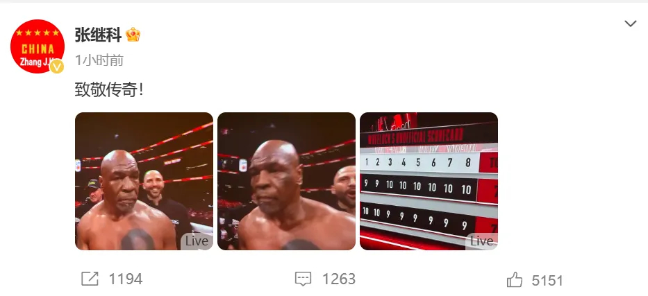 赛后,乒乓球奥运冠军张继科发文表达了对泰森的尊敬,称:致敬传奇!