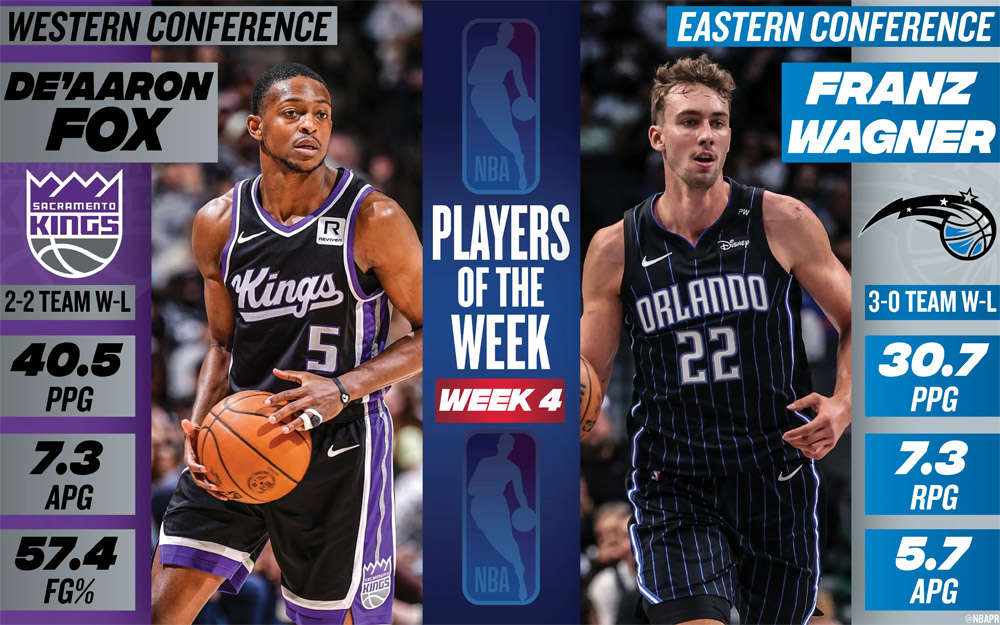 央视网消息:北京时间11月19日,NBA官方公布了常规赛第四周的周最佳球员,魔术前锋弗朗次-瓦格纳和国王后卫达龙-福克斯分别当选各自分区的周最佳。