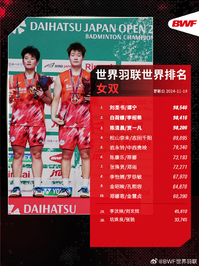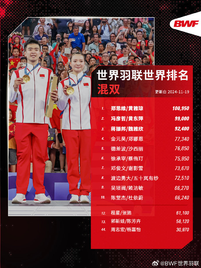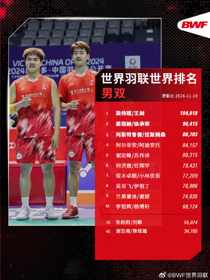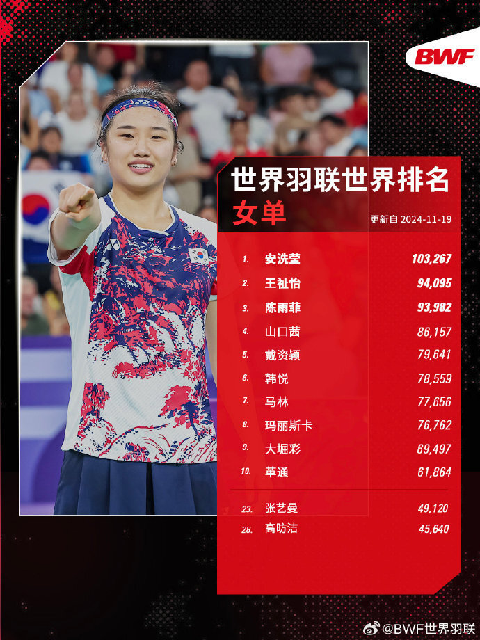 世界羽联公布2024年第47周世界排名,石宇奇位列男单第一