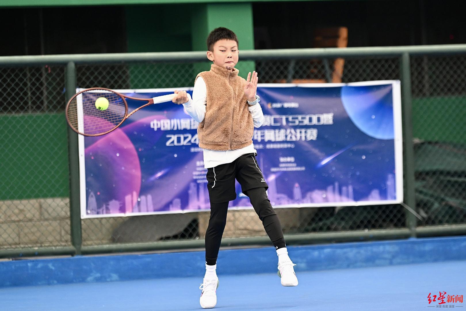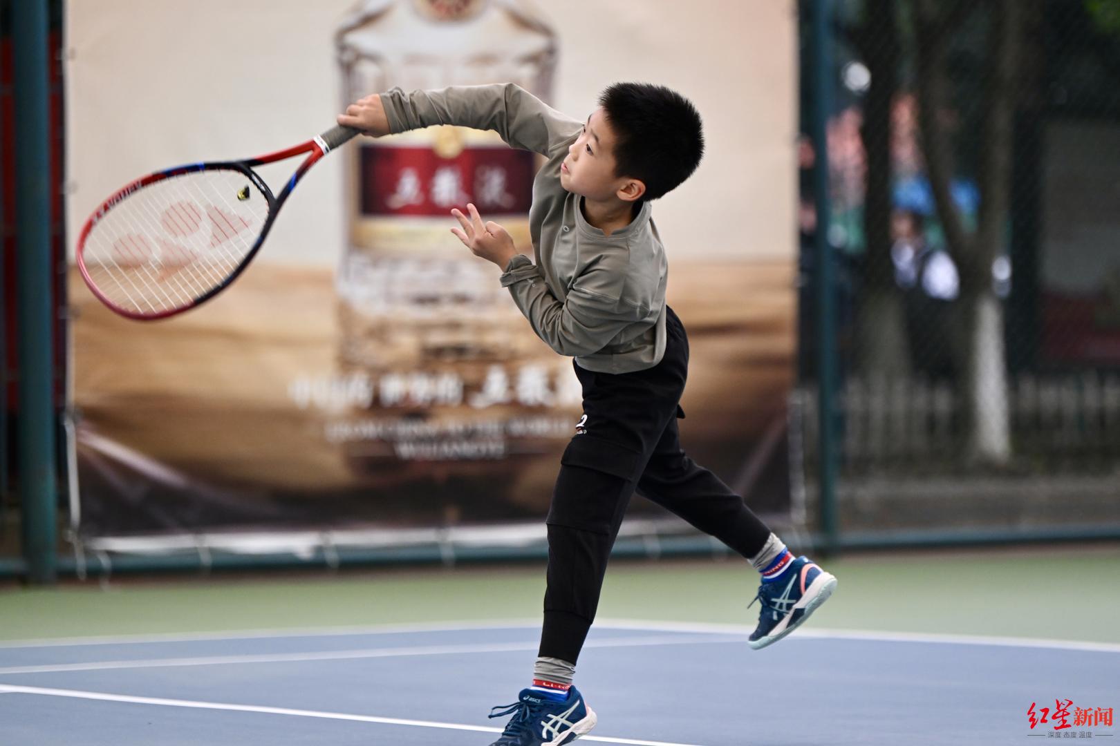 10岁的泸州小朋友王睿宸在爸爸的陪伴下来到成都参赛,他的爸爸介绍称,儿子练习网球已有五年,“这次带他来成都参赛,希望能锻炼一下孩子在大场面下的比赛能力。”