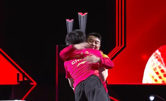 决赛夺冠后,王楚钦奔向自己的教练王皓,拥抱着享受胜利的喜悦。