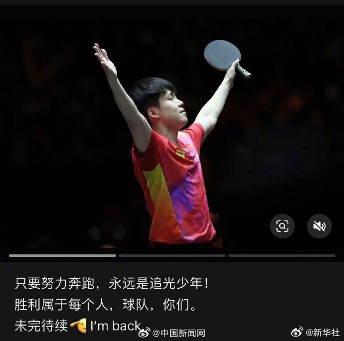 11月25日,王楚钦社媒发文:只要努力奔跑,永远是追光少年!胜利属于每个人,球队,你们。未完待续,I'm back。