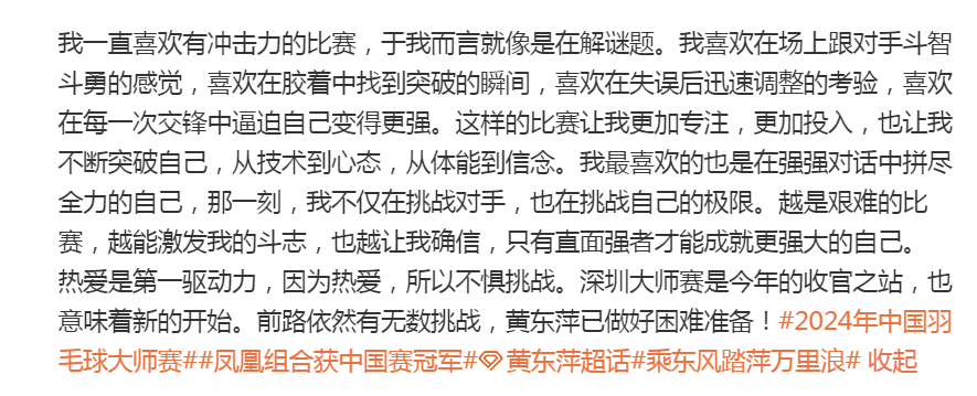 两年前,我和小冯第一次用虚拟积分报了丹麦公开赛。初出茅庐,也曾拿下几个冠军,但尚未成熟的我们并不稳定。回头看,失败并不可怕,可怕的是停滞不前。每一次跌倒后重新站起,都是一种沉淀与突破。我一直坚信的是,人生就像耕耘,比赛中丢掉的每一分,训练中的每一次的挥拍,力量房里的每一次举铁,都是我们为自己种下的种子。在春天播种,不会立刻开花结果,不用想起那些失去希望和紧咬牙关的时刻,因为我深知正因为我们有能力跨越,这些考验才会降临。不放弃地脚踏实地坚持下去,在秋天就一定会收获。两年后的今天,我们成为了一号种子。@F冯彦哲