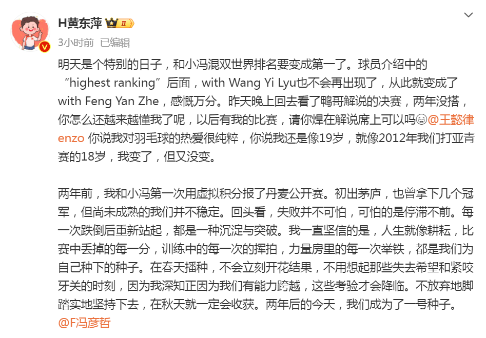 明天是个特别的日子,和小冯混双世界排名要变成第一了。球员介绍中的“highestranking”后面,with Wang Yi Lyu也不会再出现了,从此就变成了with Feng Yan Zhe,感慨万分。昨天晚上回去看了鸭哥解说的决赛,两年没搭,你怎么还越来越懂我了呢,以后有我的比赛,请你焊在解说席上可以吗,@王懿律enzo。你说我对羽毛球的热爱很纯粹,你说我还是像19岁,就像2012年我们打亚青赛的18岁,我变了,但又没变。