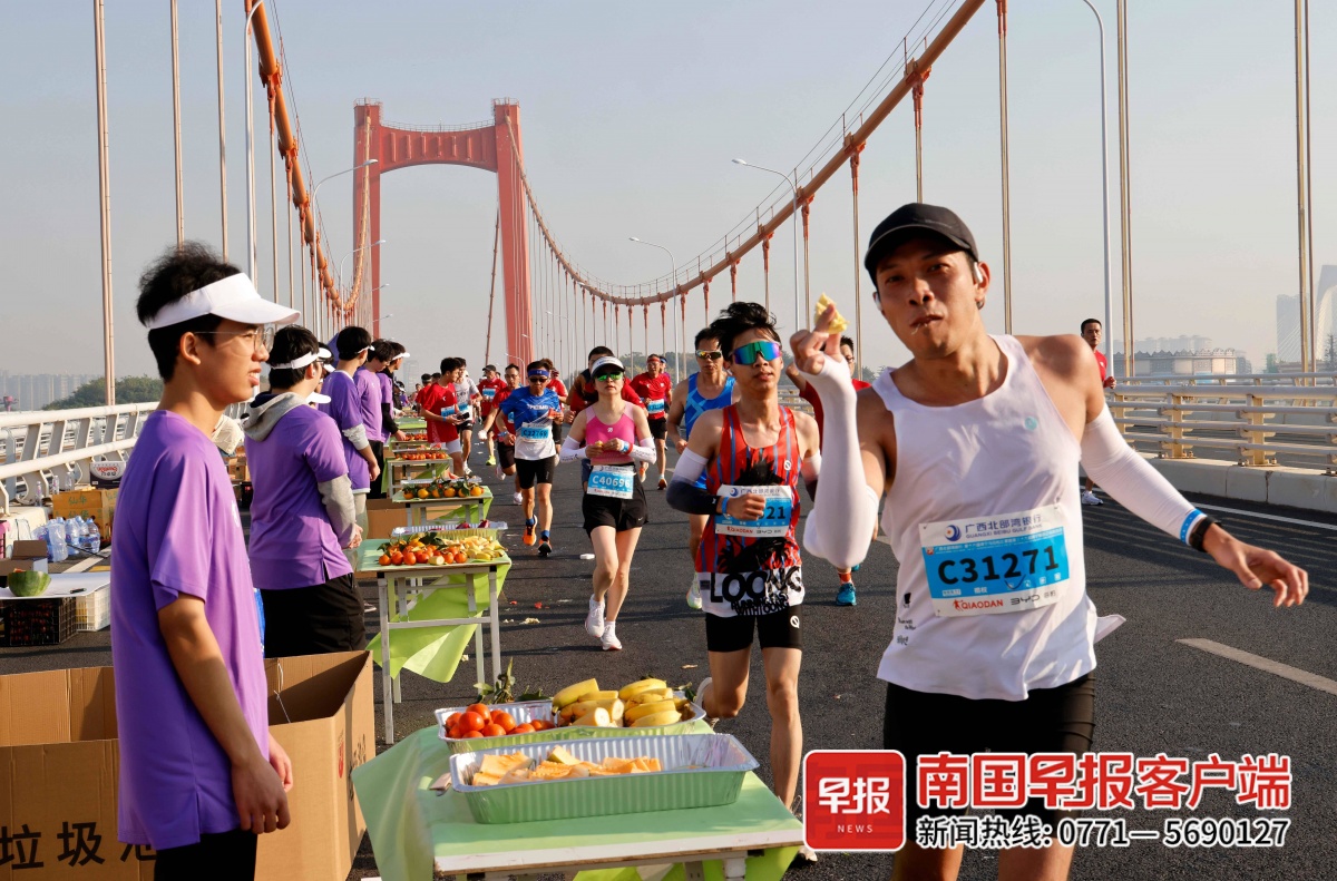 ▲12月1日,2024南宁马拉松开跑,参加半程马拉松的选手们经过良庆大桥补给点。记者 苏华 摄