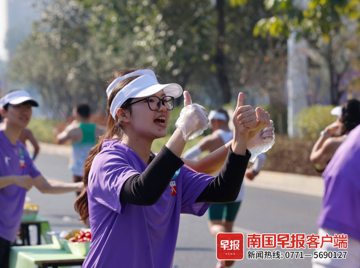 “恭喜完赛!”“您真美!”“您真帅!”在现场,身着紫色上衣的“小邕宝”热情洋溢,有条不紊地忙碌着。许多参赛选手表示,从未在其他赛事中体验过志愿者夹道欢迎打气,“小邕宝”的活力与激情让他们的南马之旅有了别样体验。