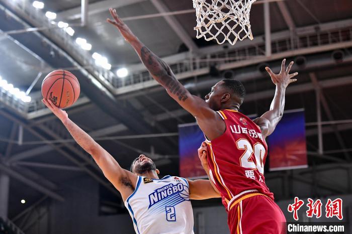 12月1日,宁波町渥队球员霍华德(白)在比赛中上篮遭遇山西汾酒队球员贾尔斯封盖。当日,在太原进行的2024-2025赛季中国男子篮球职业联赛(CBA)常规赛第12轮比赛中,山西汾酒队主场以140比116战胜宁波町渥队。 中新社 记者 韦亮 摄