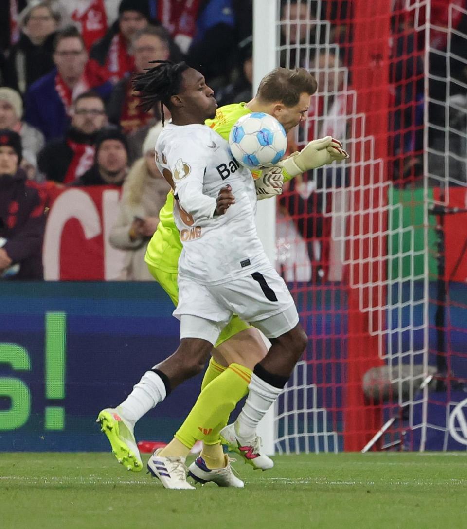 12月3日,拜仁慕尼黑队守门员诺伊尔(后)在比赛中出击撞倒对手被红牌罚下。新华社发(菲利普·鲁伊兹摄)