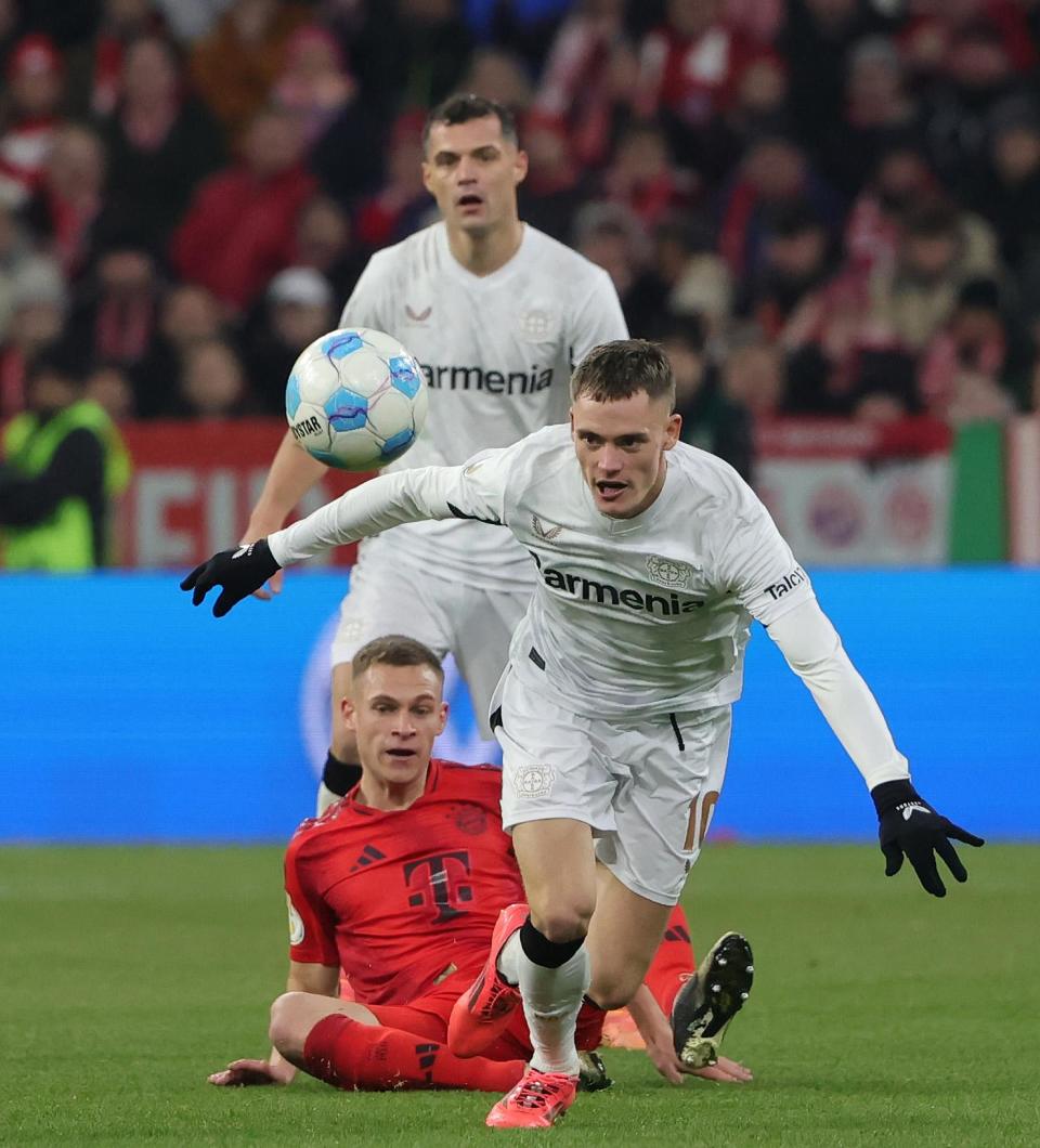 12月3日,拜仁慕尼黑队球员基米希(下)与勒沃库森队球员维尔茨(前)在比赛中拼抢。新华社发(菲利普·鲁伊兹摄)