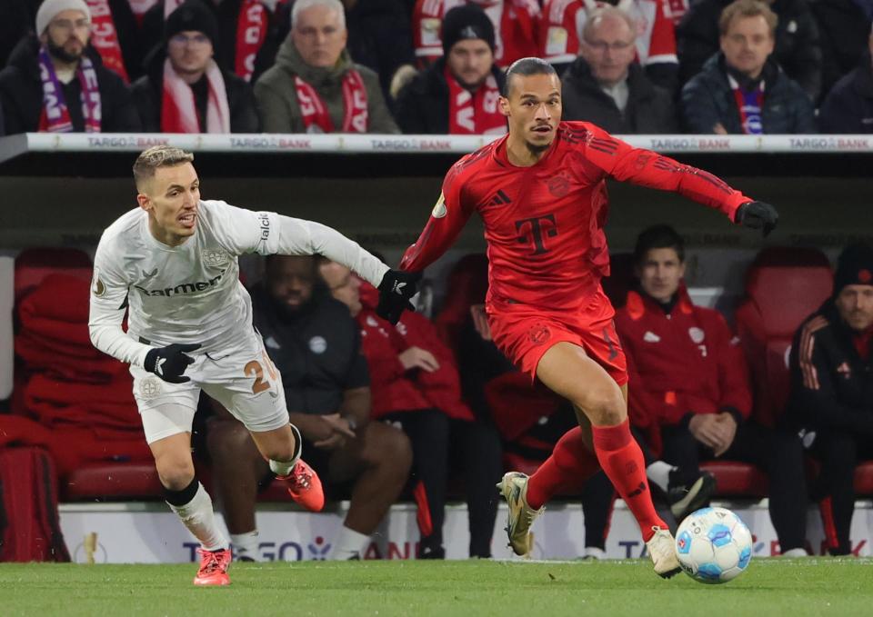 12月3日,拜仁慕尼黑队球员萨内(右)与勒沃库森队球员格里马尔多在比赛中拼抢。新华社发(菲利普·鲁伊兹摄)
