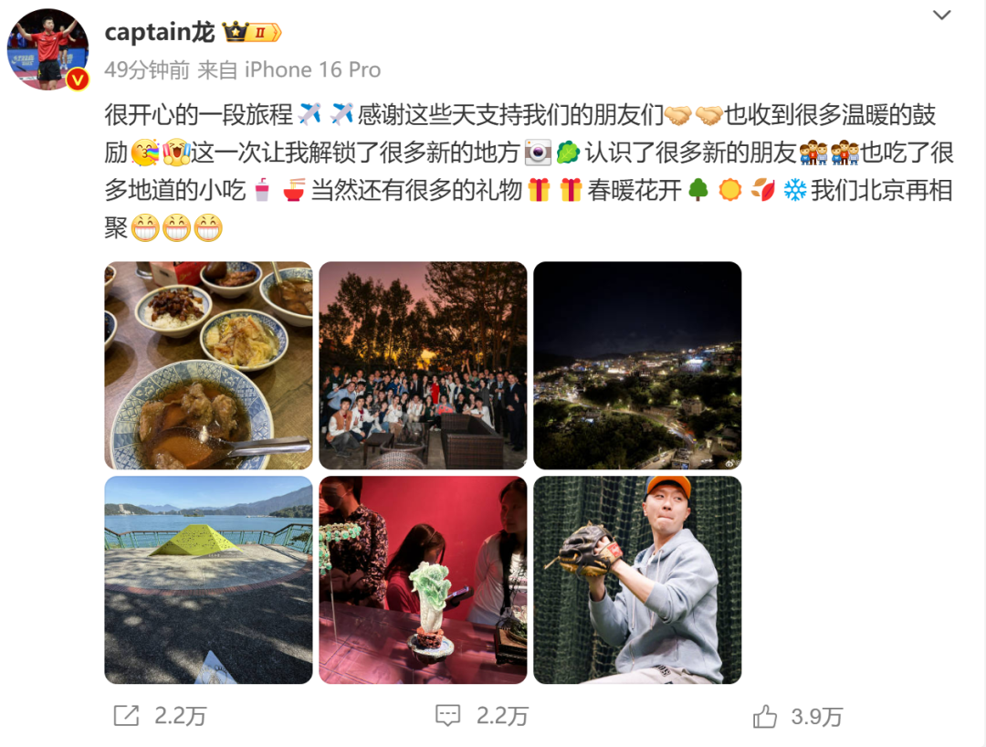 大陆高校师生赴台访问9天8夜行程落下帷幕,12月5日,马龙也在社交媒体发文晒照:“很开心的一段旅程,感谢这些天支持我们的朋友们,也收到很多温暖的鼓励。这一次让我解锁了很多新的地方,认识了很多新的朋友,也吃了很多地道的小吃,当然还有很多的礼物。春暖花开,我们北京再相聚。”