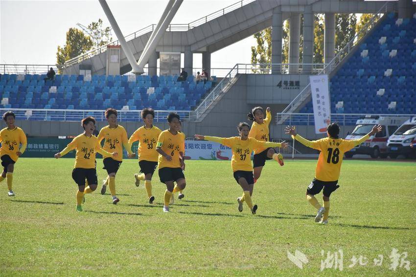 在11月28日争夺女足第九名决赛中,湖北队常规时间0比0战平湖南队,最终通过点球大战获胜。图为湖北队队员庆祝胜利。(组委会供图)