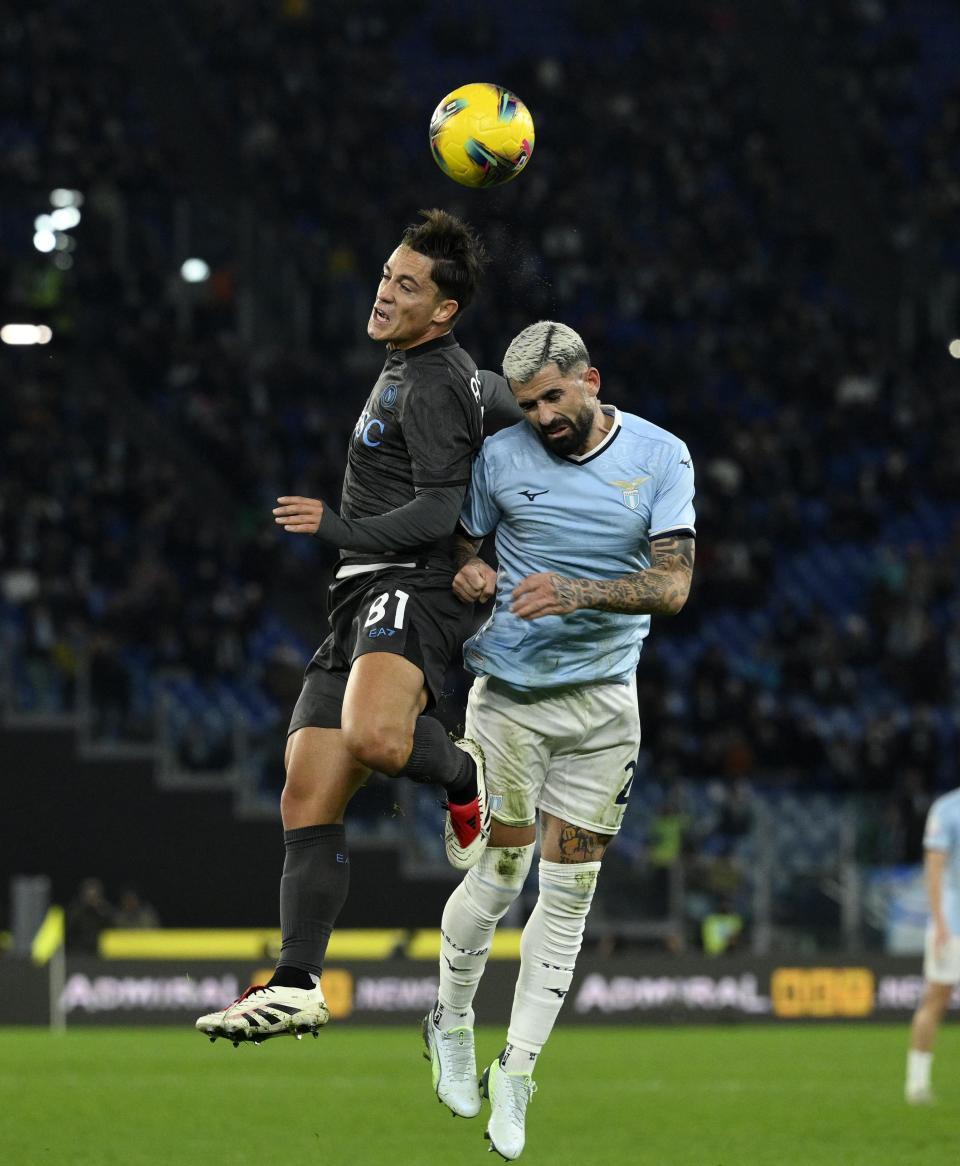 12月5日,拉齐奥队球员希萨伊(右)与那不勒斯队球员拉斯帕多里争顶。新华社发(阿尔贝托·林格利亚摄)