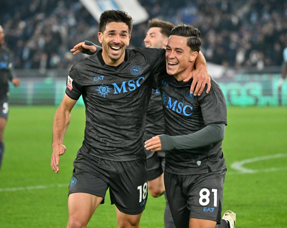 12月5日,那不勒斯队球员西蒙尼(左)进球后与队友拉斯帕多里庆祝。新华社发(阿尔贝托·林格利亚摄)