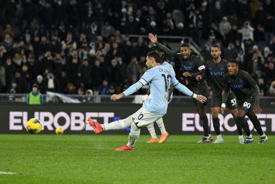 12月5日,拉齐奥队球员扎卡尼(前)在比赛中主罚点球。新华社发(阿尔贝托·林格利亚摄)