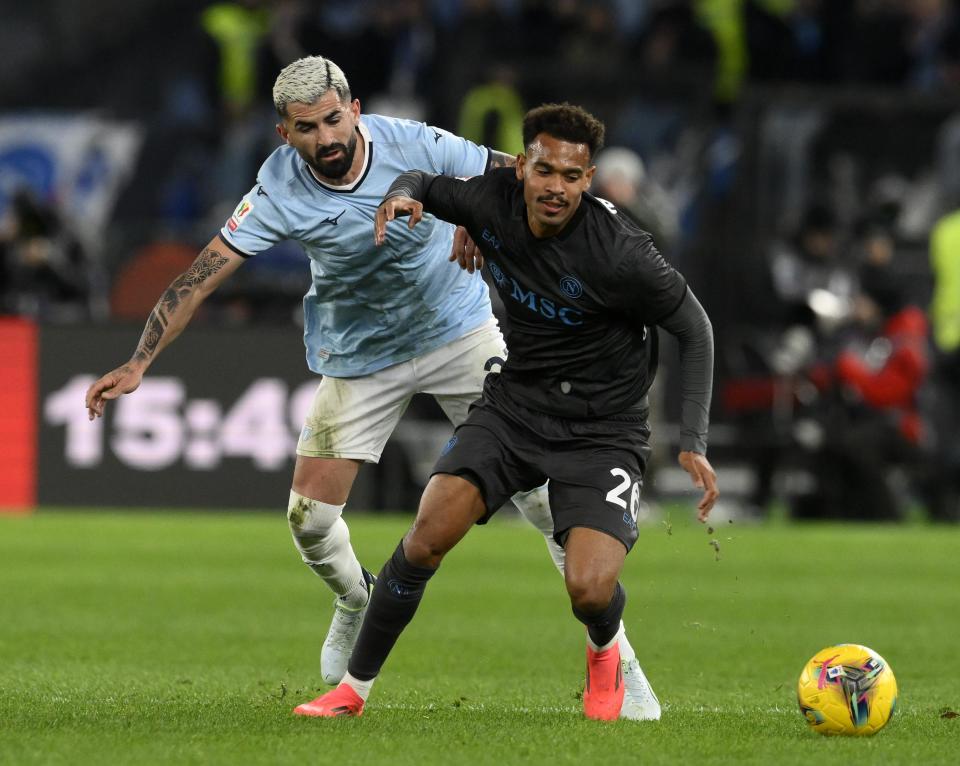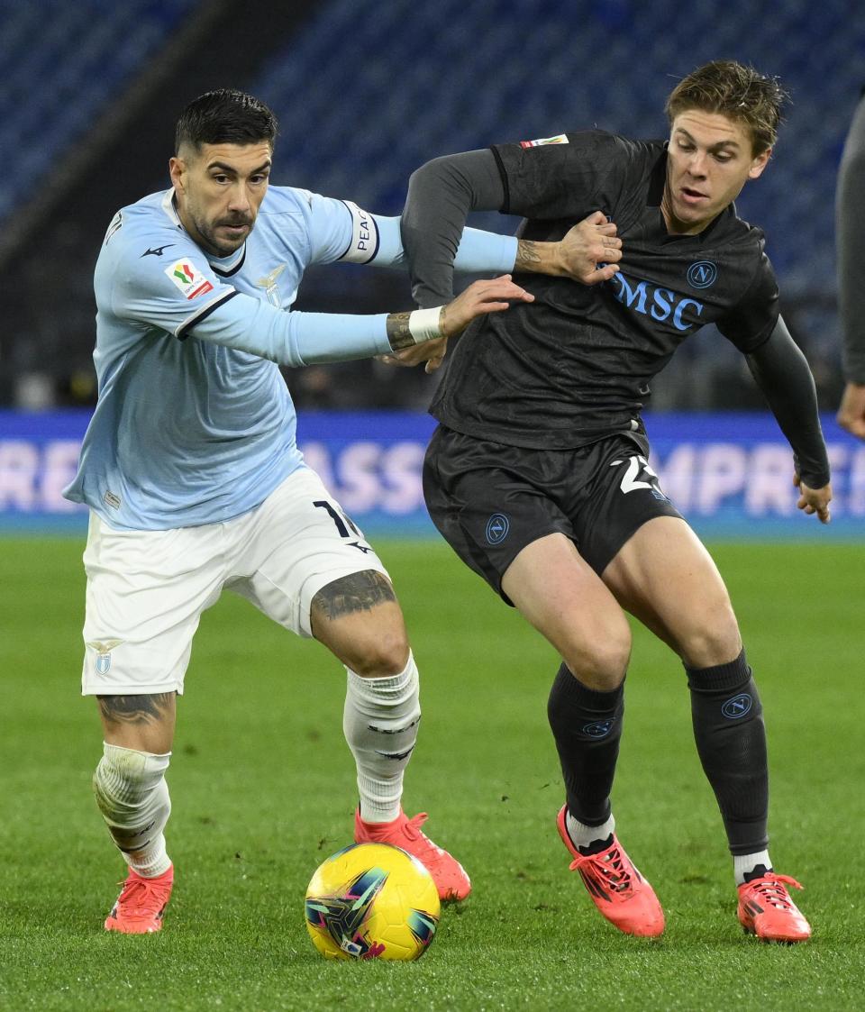 12月5日,拉齐奥队球员扎卡尼(左)与那不勒斯队球员泽尔宾拼抢。新华社发(阿尔贝托·林格利亚摄)