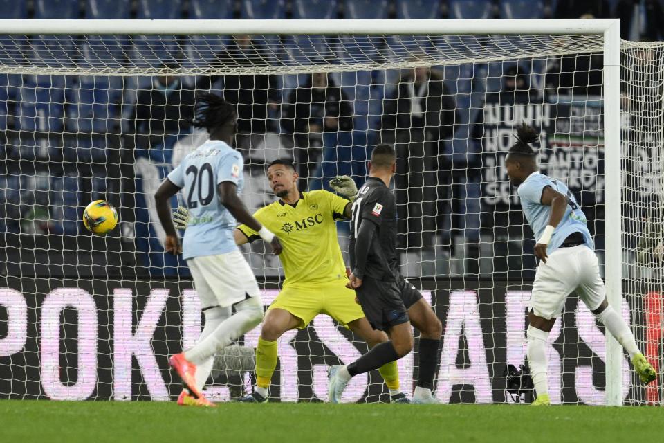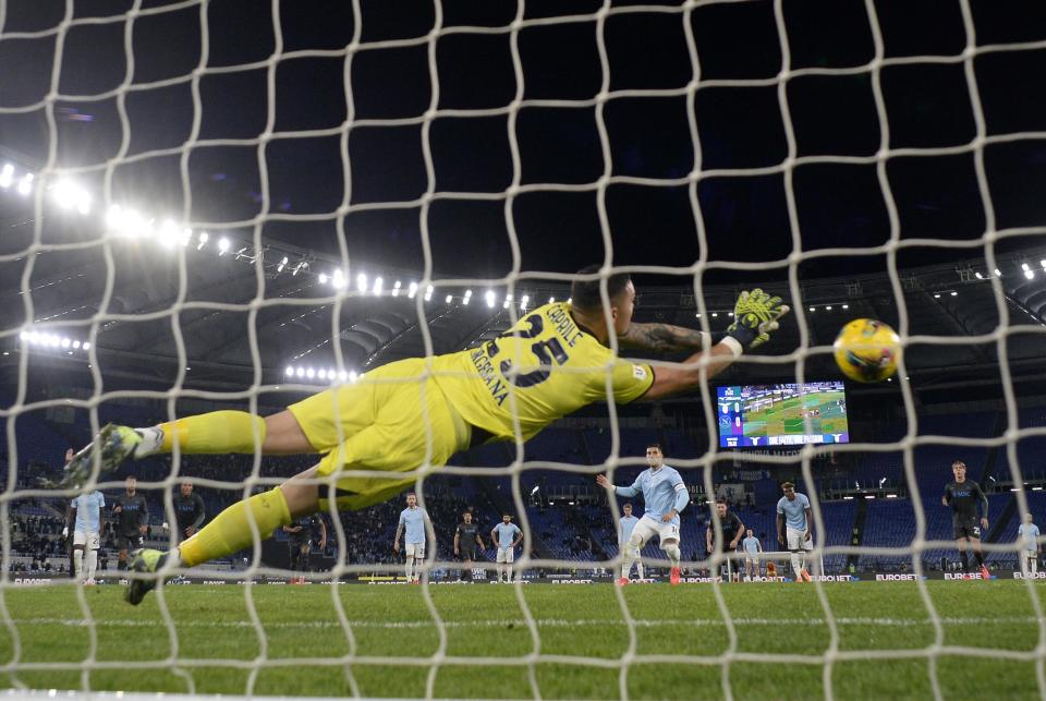 12月5日,那不勒斯队守门员卡普里莱(前)扑出拉齐奥队球员扎卡尼(10号)的点球。新华社发(阿尔贝托·林格利亚摄)
