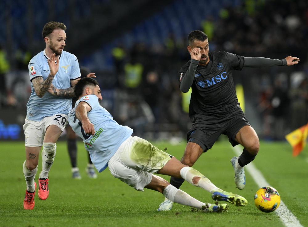 12月5日,拉齐奥队球员吉戈(中)与那不勒斯队球员斯皮纳佐拉(右)拼抢。新华社发(阿尔贝托·林格利亚摄)