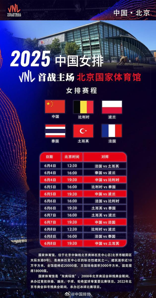 国际排联10日在官网公布了2025年世界女排联赛的分站赛承办地点,北京将承办首站赛事,举办地点为国家体育馆。