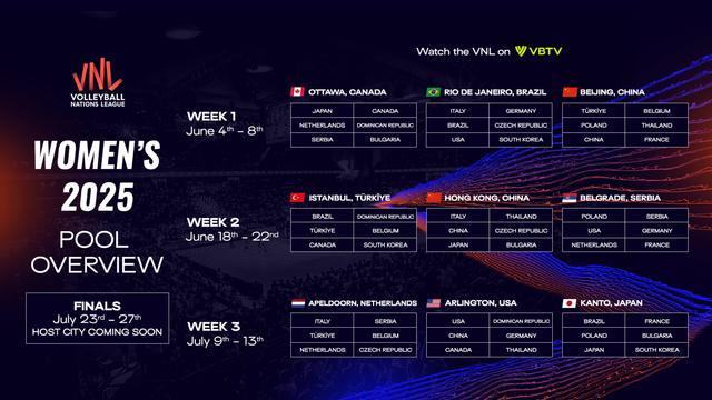 根据信息,2025年世界女排联赛分站赛计划于2025年6月4日至7月13日举行,分为三站,分别在9座城市举办。