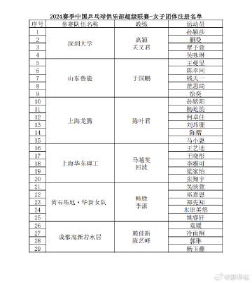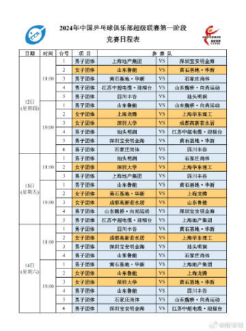 #2024乒超联赛第一阶段赛程表#【#2024乒超联赛明日开赛#】12日至16日,2024赛季中国乒乓球俱乐部超级联赛第一阶段比赛将在湖南长沙举行。各参赛俱乐部的运动员注册名单,以及12日至14日的竞赛日程已经确定。经过单循环对决,男女团体排名前四的俱乐部将晋级总决赛。期待@王楚钦___ @樊振东 @林詩棟y@孙颖莎 @王曼昱 等运动员的精彩表现!(记者:谭畅)