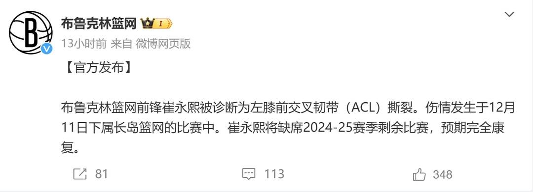 12月14日凌晨,NBA布鲁克林篮网发布官方微博,布鲁克林篮网前锋崔永熙被诊断为左膝前交叉韧带(ACL)撕裂。伤情发生于12月11日下属长岛篮网的比赛中。崔永熙将缺席2024-25赛季剩余比赛,预期完全康复。