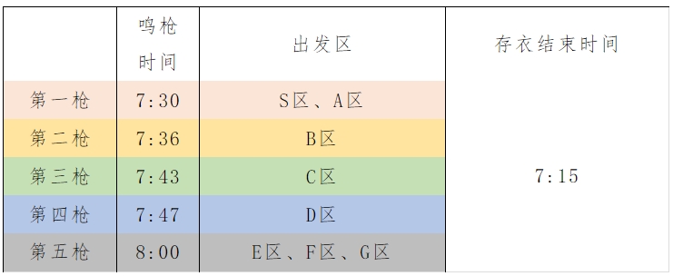 为保证参赛选手安全,充分缓解赛前存衣、安检、检录、赛中补给、赛后服务等环节的压力,组委会将采用分枪起跑的发令方式。具体发枪时间如下: