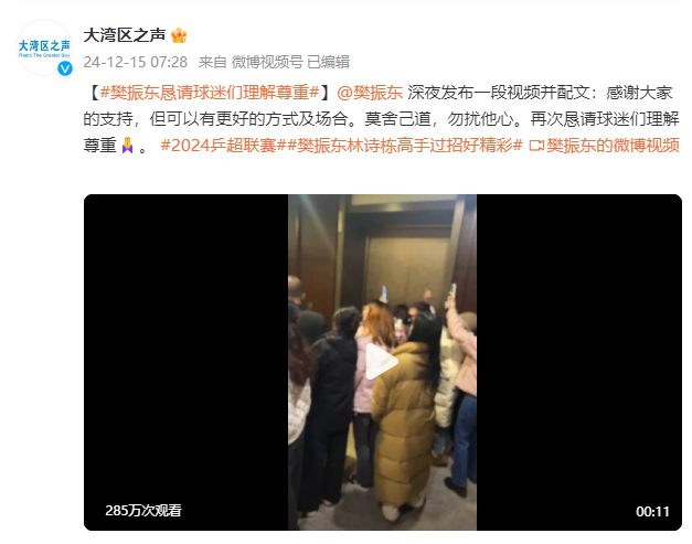樊振东深夜发布一段视频并配文:感谢大家的支持,但可以有更好的方式及场合。莫舍己道,勿扰他心。再次恳请球迷们理解尊重。