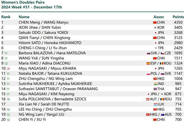 女双方面,陈梦/王曼昱排名第一。