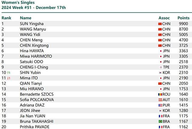 女单方面,孙颖莎以9900分继续霸榜第一,王曼昱、王艺迪、陈梦、陈幸同分别位列第二至第五。