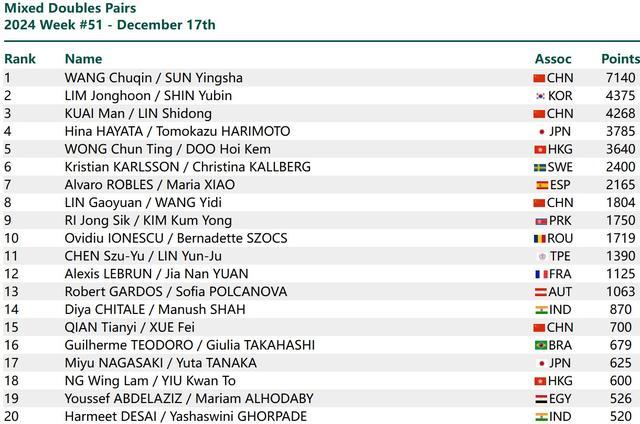 混双方面,王楚钦/孙颖莎排名第一。