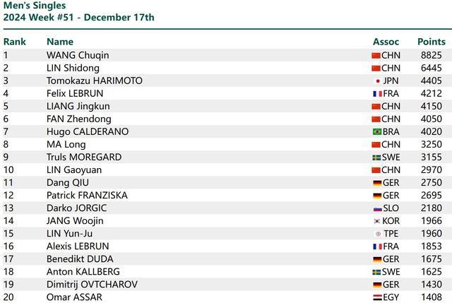 男单方面,王楚钦以8825分继续排名第一。林诗栋排名第二,梁靖崑排名第五,樊振东排名第六,马龙排名第八,林高远排名第十。
