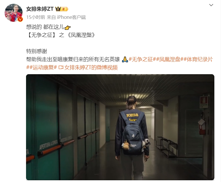 2024年的12月20日深夜,朱婷发布首部纪录片,并配文“想说的都在这儿,【无争之征】之《凤凰涅槃》,特别感谢帮助我走出至暗康复归来的所有无名英雄”。