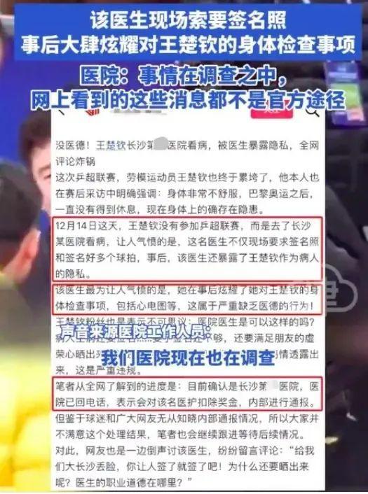 据网传截图显示,12月14日,王楚钦没有参加乒超联赛,而是去了长沙某医院就诊。让人气愤的是,医生不仅现场要求签名照和签名球拍,事后还曝光了王楚钦作为患者的隐私,包括心电图等。
