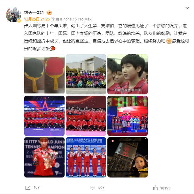 12月25日晚,中国乒乓球运动员钱天一在社交平台发文,回顾自己十年来的历程。相关话题也登上社交平台热搜。