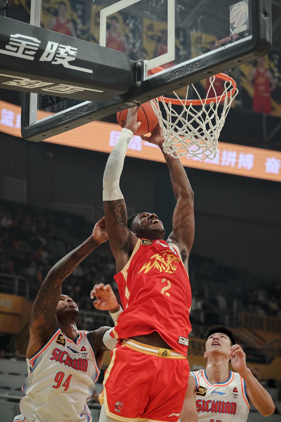 12月26日,浙江方兴渡队球员奈特(中)在比赛中拼抢篮板球。新华社记者 江汉 摄