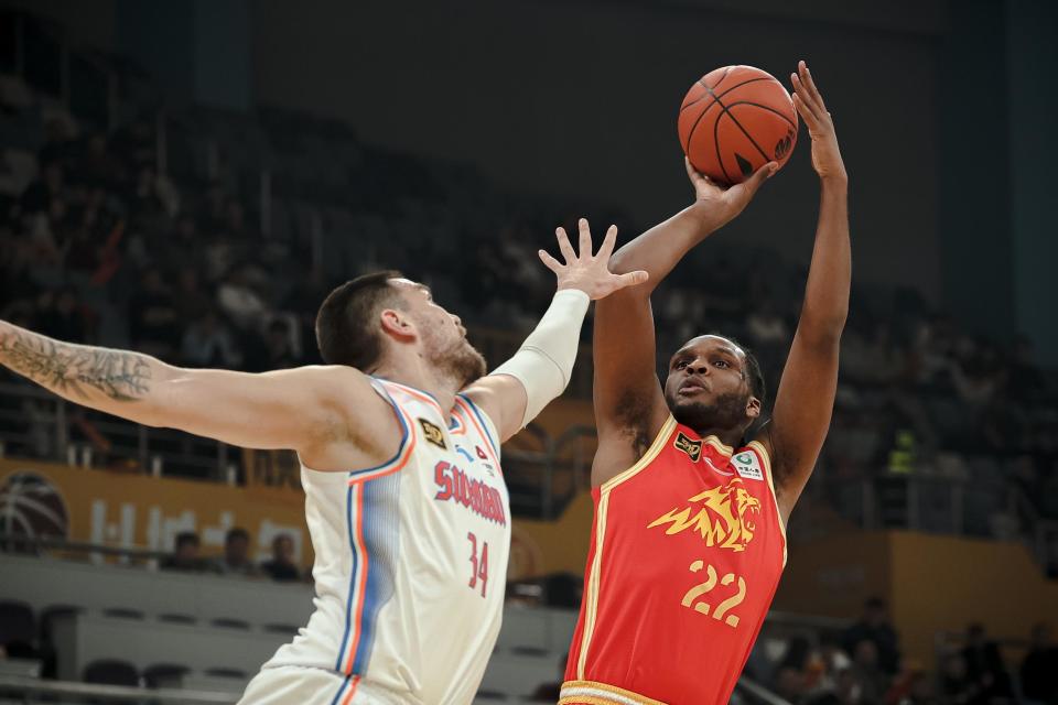 12月26日,浙江方兴渡队球员卡尔顿(右)在比赛中投篮。新华社记者 江汉 摄