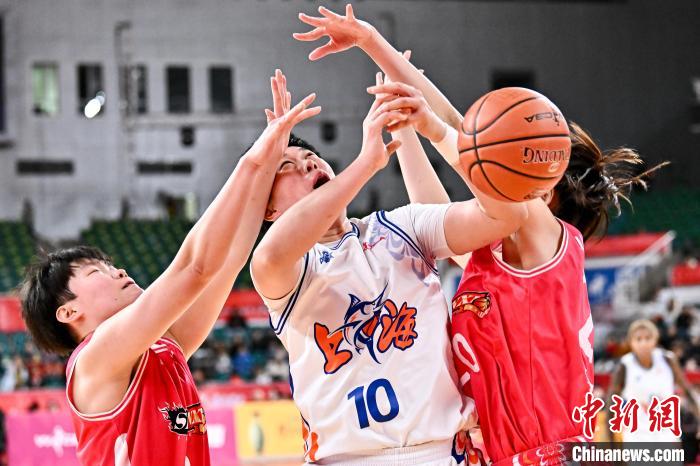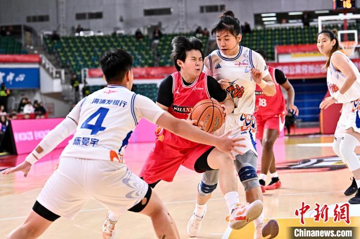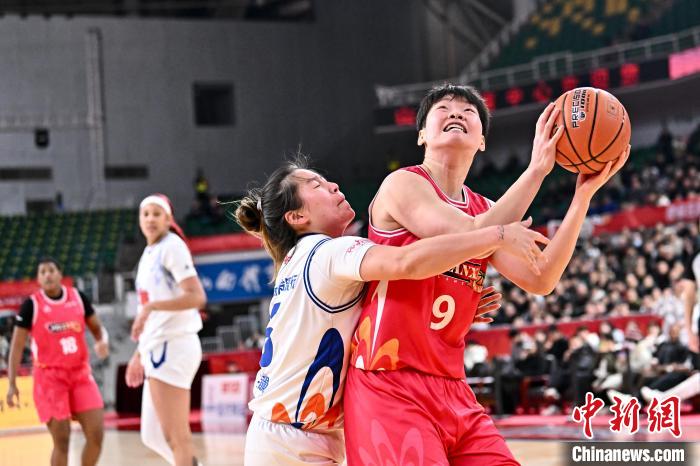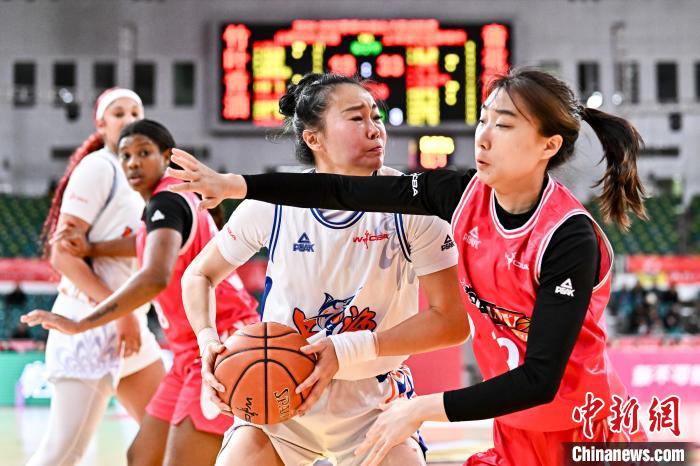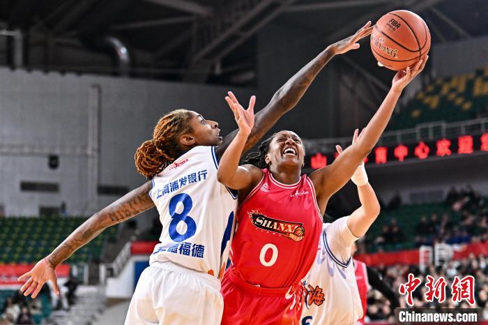 12月27日,上海浦发银行队球员张芷婷(白)在比赛中上篮被封盖。 中新社记者韦亮摄