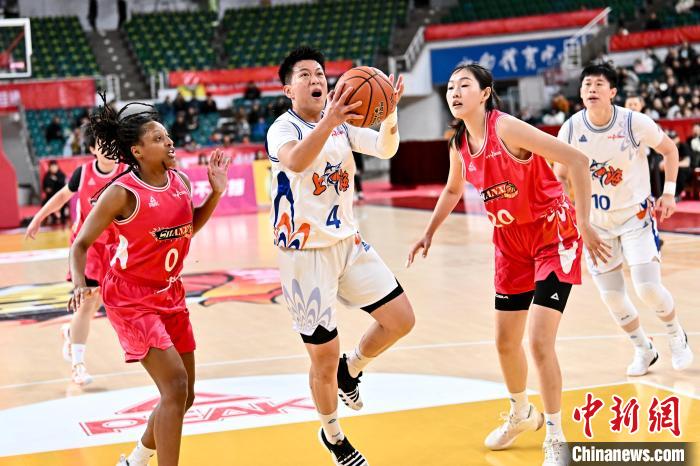 12月27日,山西竹叶青酒队球员米切尔(红)在比赛中上篮。 中新社记者韦亮摄